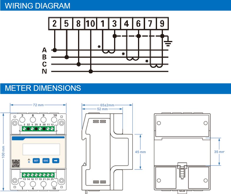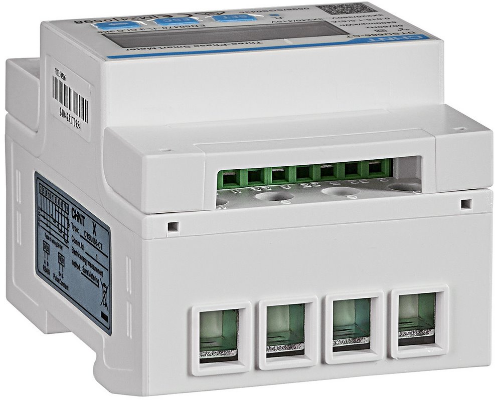 Kompaktní konstrukce elektroměru umožňuje rychlou montáž na DIN lištu 35 mm, což šetří místo v rozvaděči a zjednodušuje instalaci. Vizuální identifikace svorek minimalizuje riziko chyb při zapojení. Podpora sítí 3P4W a 3P3W spolu s možností měření proudu až do 250 A zajišťuje univerzální použití s trojfázovými měniči i dalšími energetickými prvky. Rozhraní RS485 s protokolem Modbus-RTU umožňuje snadnou integraci do nadřazených systémů řízení.