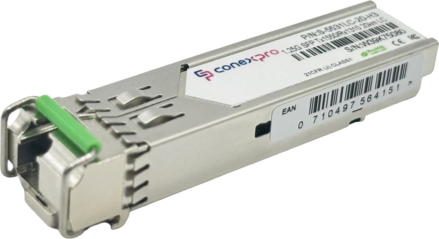 Gigabitový WDM/Bidi Singlemode SFP modul od výrobce Conexpro s vlnovou délkou (Tx/Rx) 1550/1310 nm, rychlostí 1 Gbps, vybavený jedním LC konektorem s UPC broušením a je určený pro spojení na vzdálenost 20 km. Modul je speciálně upraven pro zajištění široké kompatibility, včetně plné podpory zařízení HP / H3C / 3Com a dalších značek dle MSA standardu. Samozřejmostí je podpora diagnostiky optického spoje pomocí funkce DDM (Digital Diagnostic Monitoring).