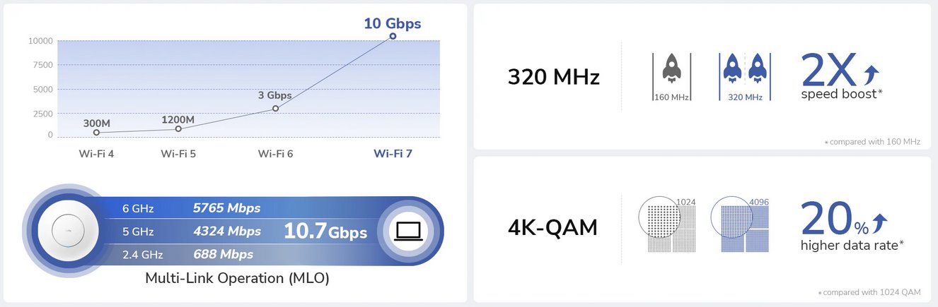 Výkonný Wi-Fi přístupový bod s technologií Wi-Fi 7 nabízí špičkový výkon pro firmy, hotely a veřejné prostory. S rychlostí až 688 Mbps (2.4 GHz) + 4320 Mbps (5 GHz) + 5760 (6 GHz) a šířkou kanálu 320 MHz zajišťuje tento třípásmový přístupový bod extrémně rychlé připojení pro až 300 zařízení současně. Díky technologii Multi-Link Operation (MLO) a 4K-QAM nabízí nízkou latenci a stabilní připojení, i při vysoké zátěži. Speciální 6GHz pásmo poskytuje čisté a nerušené připojení pro profesionální nasazení, což je ideální pro komerční prostředí, kde je kladeno důraz na stabilitu a vysokou propustnost.