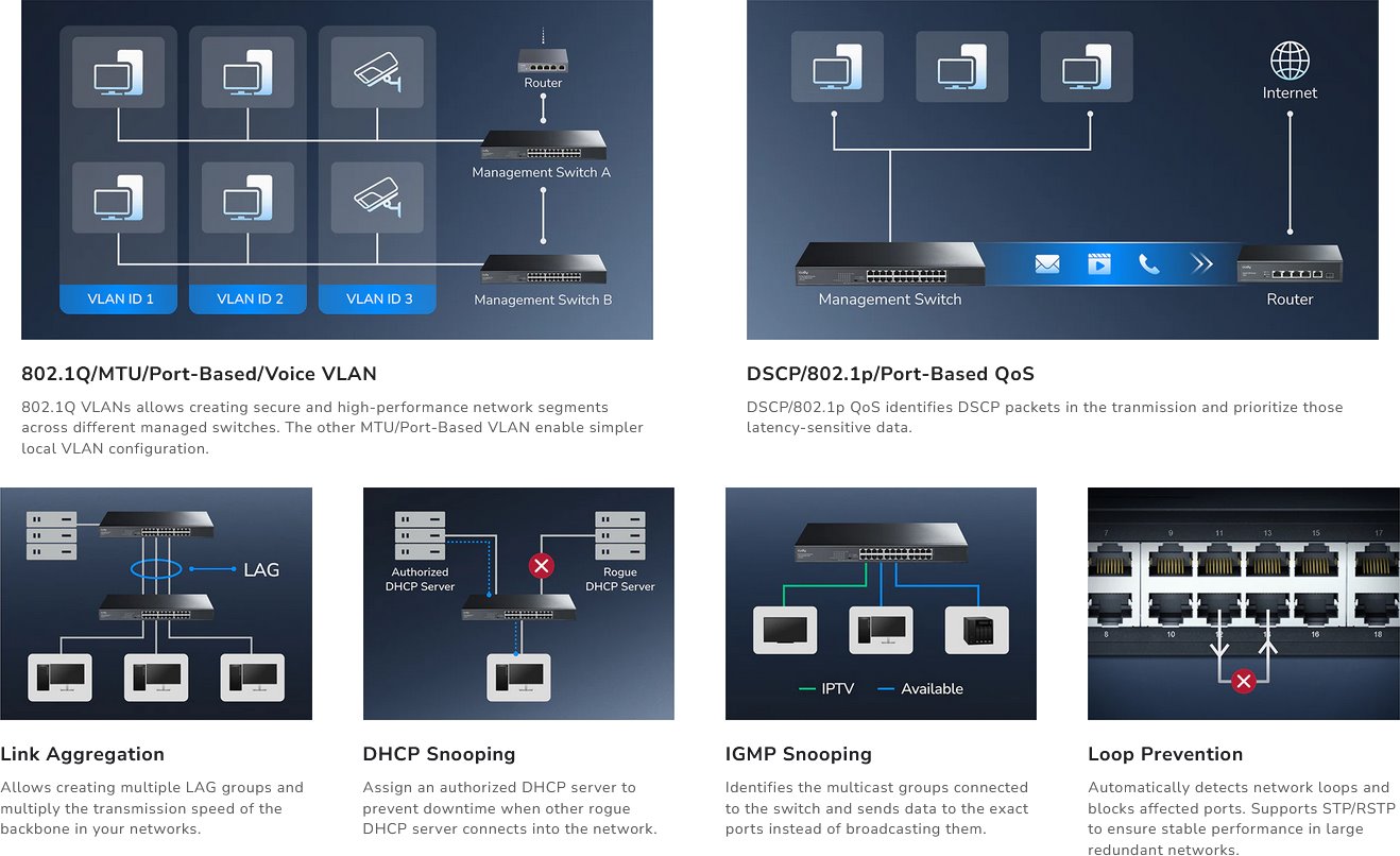 Intuitivní webová správa a SNMP poskytují plnou kontrolu nad sítí. VLAN technologie včetně 802.1Q, MTU a port-based režimů umožňují vytvářet bezpečné a výkonné síťové segmenty. Díky QoS s podporou DSCP a 802.1p jsou hlasová a video data vždy upřednostněna. Nechybí agregace linek pro vyšší propustnost, zrcadlení portů pro diagnostiku, STP/RSTP proti smyčkám ani ochranné funkce DHCP a IGMP Snooping pro stabilní a efektivní přenos dat.