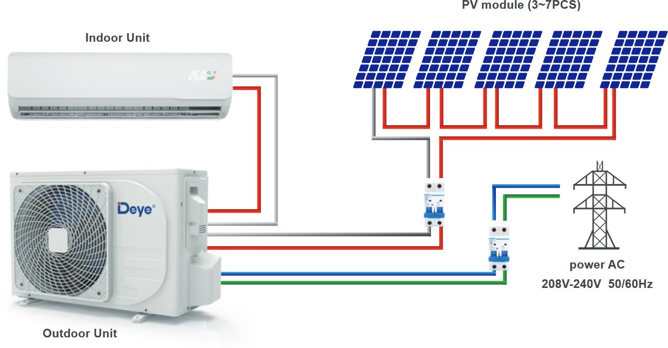 Moderní solární klimatizace značky DEYE kombinuje energii ze solárních panelů a elektrické sítě, což umožňuje energeticky úsporný provoz. V létě efektivně ochlazuje s výkonem 4100 až 20400 BTU, zatímco v zimě poskytuje vyhřívací výkon 1500–5250 W. S možností připojení 3–7 solárních panelů s MPPT napětím 80–380 V DC šetří 60 až 100 % energie oproti běžným jednotkám. Jednoduchá instalace, integrovaná Wi-Fi s mobilní aplikací a přehledné statistiky dělají z této jednotky ideální řešení pro domácnosti, které hledají ekologický a praktický způsob regulace teploty.