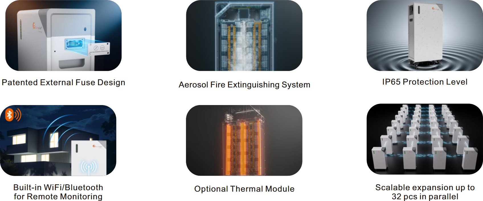 Díky možnosti paralelního zapojení až 32 jednotek lze snadno dosáhnout celkové kapacity až 512 kWh, což umožňuje růst systému podle aktuálních potřeb. Odolné provedení s krytím IP65 zajišťuje spolehlivý provoz i v náročných podmínkách. Integrované WiFi a Bluetooth umožňují vzdálený monitoring a správu v reálném čase, což přináší maximální kontrolu nad energií. Praktické prvky, jako externí jištění nebo snadno vyměnitelná pojistka, usnadňují údržbu a zvyšují provozní komfort.Klíčové vlastnosti