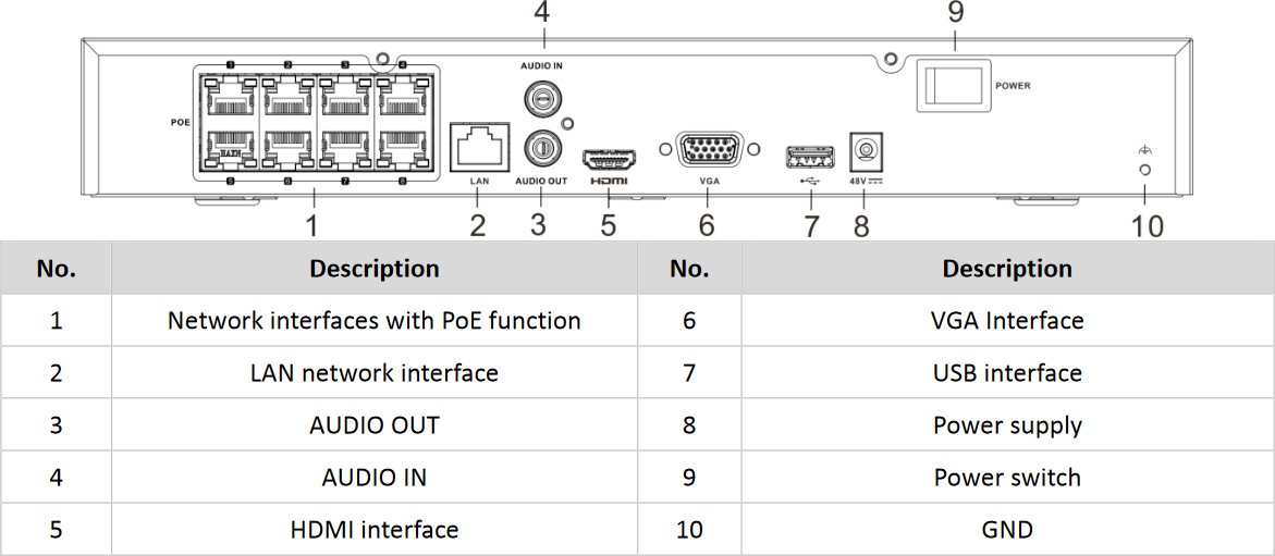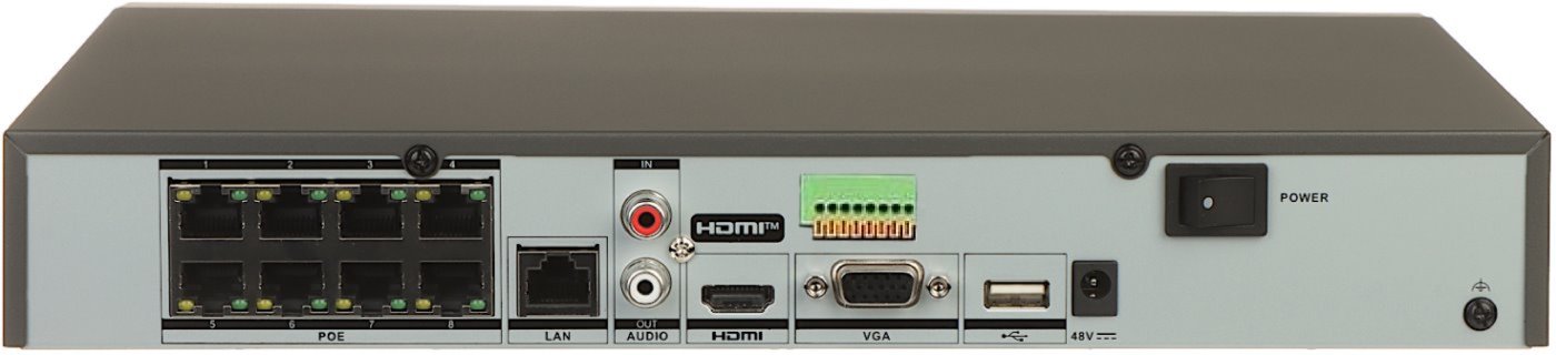 Síťový video rekordér (NVR) od výrobce Hikvision slouží pro nahrávání až 8 IP kamer v kombinaci různých rozlišení až do 12 Mpx s ukládáním dat na 1x SATA HDD do 10 TB na disk. Rekordér disponuje 1x 10/100/1000 Mbps + 8x 10/100 Mbps LAN (8x 802.3af/at PoE), PoE budgetem 75 W, audio vstupem/výstupem, alarmem 4/1, 2x USB 2.0, 1x HDMI (4K), 1x VGA a napájecím DC konektorem. Maximální spotřeba rekordéru bez HDD je 10 W. K jednoduché správě kamerového systému slouží mobilní aplikace Hik-Connect umožňující živé video, ovládání kamer a přijímání upozornění.