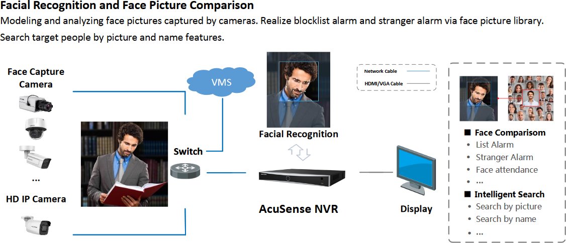 Systém podporuje pokročilou analýzu osob a vozidel s redukcí falešných alarmů díky technologii Deep Learning. Funkce rozpoznání obličeje umožňuje zachytit obličeje na 4 kanálech a porovnat je až na 8 kanálech současně. Integrované kamery s funkcí VCA umožňují automatickou detekci časových, prostorových a obrazových událostí, zatímco Motion Detection 2.0 a ochrana perimetru monitorují narušení oblastí a pohyb osob či vozidel.