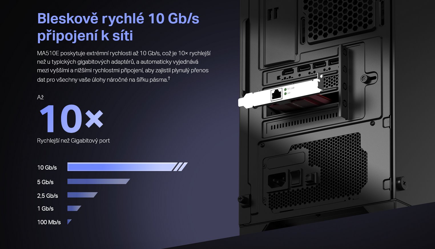Síťový adaptér s výkonem až 10 Gb/s posouvá datové přenosy na zcela novou úroveň – ideální pro práci s velkými soubory, streaming ve vysokém rozlišení nebo profesionální využití. Díky funkci Multi-Speed se automaticky přizpůsobí dostupné rychlosti sítě a zajistí stabilní provoz i v náročných podmínkách. Připojení k NAS zařízením probíhá bleskově, což z něj činí perfektní řešení pro lokální vysokorychlostní úložiště. Mechanismus řízení toku Flow Control garantuje přenos bez ztráty paketů a výrazně snižuje latenci, takže poskytuje multi-gigabitový zážitek i při maximální zátěži.