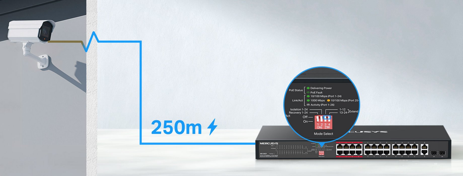 Každý port poskytuje až 30 W výkonu, přičemž celkový rozpočet činí 295 W, což umožňuje stabilní provoz i při plném zatížení. Praktický režim Extend až 250 m výrazně rozšiřuje možnosti instalace i v rozsáhlejších objektech. Priority Mode zajišťuje preferenci důležitých zařízení, například bezpečnostních kamer, zatímco Isolation Mode chrání síť oddělením provozu mezi porty a zvyšuje celkovou bezpečnost.