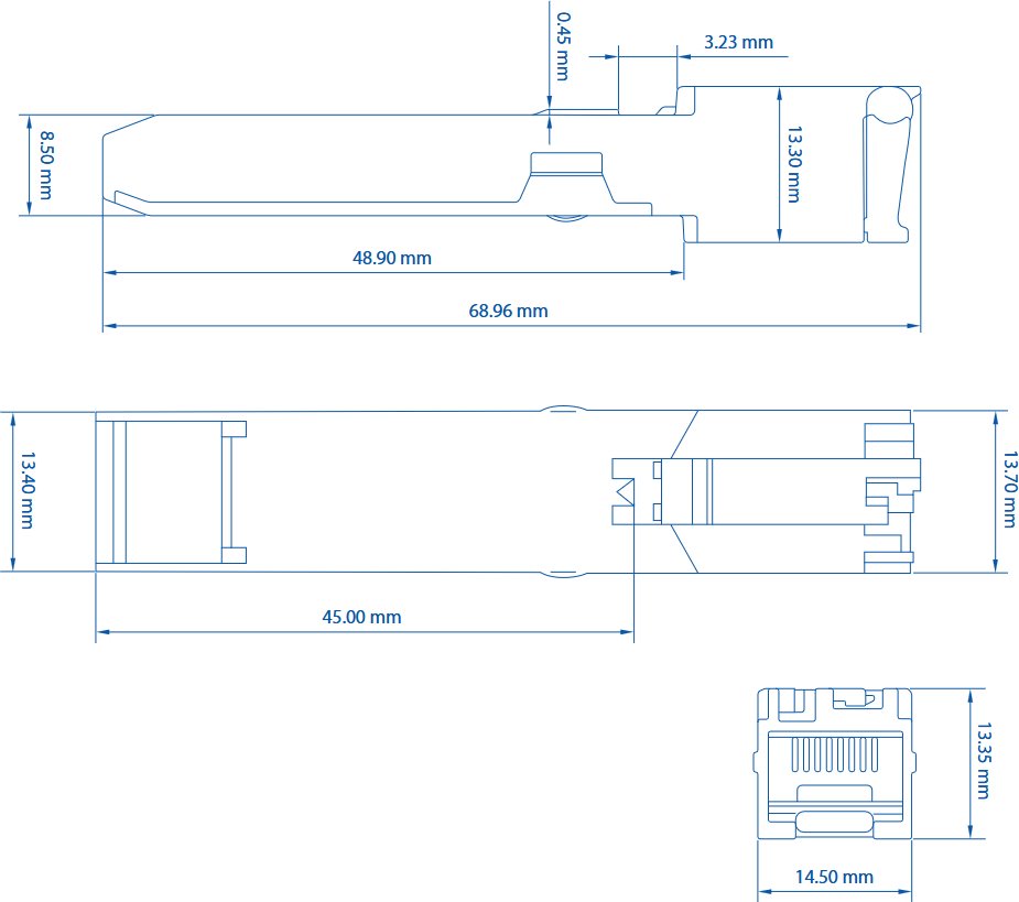 Navrženo pro spolehlivý provoz v prostředích, kde je preferováno metalické kabelování. Přenos na vzdálenost až 100 metrů poskytuje dostatečný dosah pro většinu instalací, a zároveň si modul zachovává nízkou spotřebu do 2 W.