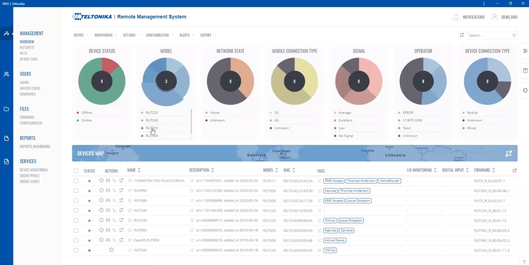 Systém vzdálené správy (RMS) usnadňuje správu a monitorování routerů a gateway Teltonika, a to i bez veřejných IP adres. Uživatelé mohou analyzovat data, měnit konfigurace pomocí profilů, přistupovat k webovému rozhraní a provádět hromadné aktualizace firmwaru. RMS také umožňuje přístup k zařízením připojeným za routerem, což usnadňuje jejich správu na dálku.