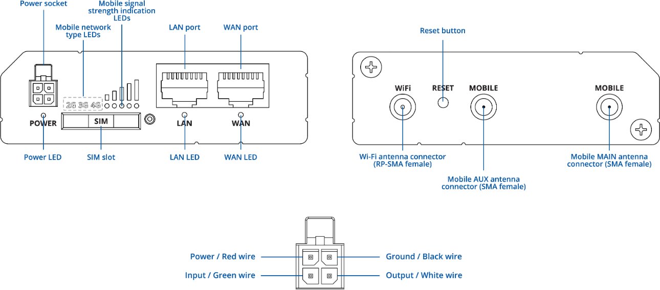 Kabelový adaptér slouží k oddělení napájení a I/O signálů pro zařízení Teltonika. Na jedné straně je vybaven 4-pinovým samičím konektorem, který se připojuje k zařízení, na druhé straně 4-pinovým konektorem a
