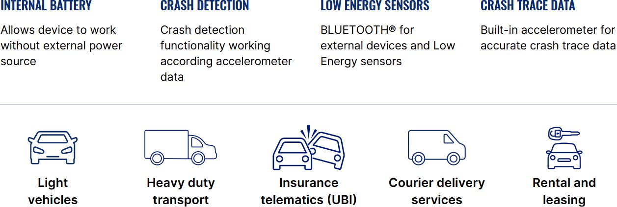 Zařízení je vybaveno funkcemi, které posouvají správu vozového parku na vyšší úroveň. Detekce nehody na základě akcelerometru poskytuje okamžitou informaci o incidentu, zatímco detailní záznam crash dat pomáhá při analýze událostí. Integrovaná interní baterie 170 mAh zajišťuje provoz i bez externího napájení a podpora Bluetooth Low Energy senzorů umožňuje rozšíření o měření teploty, vlhkosti či handsfree funkce.