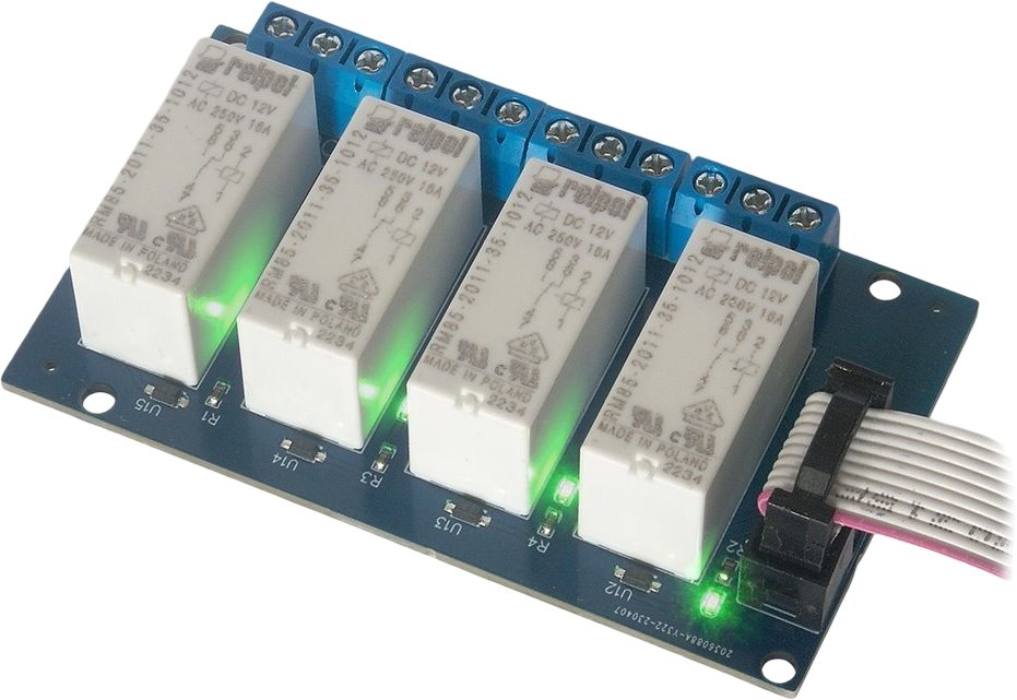 Vysokovýkonná reléová deska nabízí čtyři Relpol relé s cívkou 12 V vybavené optickou izolací vstupu, která zajišťuje bezpečný provoz a oddělení řídicích signálů od napájecí části. Speciální konstrukce kontaktů, jež při každém spínání odstraňuje oxidy kovů, prodlužuje životnost zařízení a zajišťuje dlouhodobou bezporuchovou funkci. Modul je připraven pro spolupráci s řadiči GSM i LAN, což umožňuje jeho univerzální využití v inteligentních domácích či kancelářských systémech.