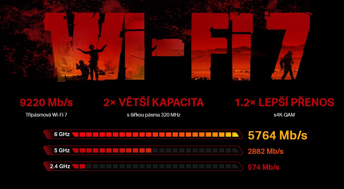 Špičkový herní router s nejnovější technologií Wi-Fi 7 přináší revoluci v domácím připojení. Díky třípásmové architektuře dosahuje rychlosti až 5764 Mb/s v pásmu 6 GHz, 2882 Mb/s v 5 GHz a 574 Mb/s v 2,4 GHz. Technologie Multi-Link Operation (MLO) umožňuje paralelní přenos přes více pásem současně, což přináší nejen vyšší rychlost, ale i stabilnější odezvu při online hrách, streamování nebo videohovorech. Výkonný čtyřjádrový procesor a 2 GB RAM zajišťují bezproblémový provoz i při vysokém zatížení celé sítě.