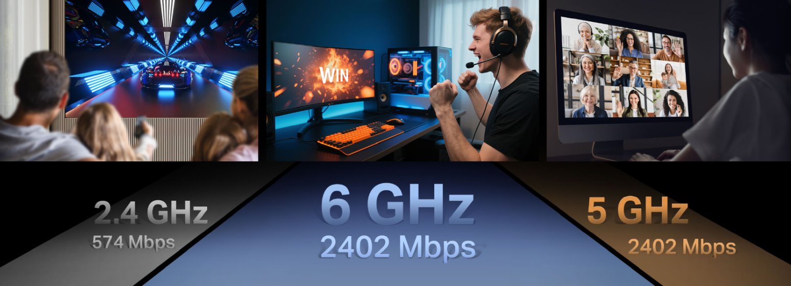 Otevřete dveře k modernímu bezdrátovému připojení s třípásmovou Wi-Fi 6E, která posouvá výkon vašeho počítače na zcela novou úroveň. Rychlostí 2402 Mb/s (6 GHz / 5 GHz) a 574 Mb/s (2,4 GHz) přináší ideální možnost pro streamování ve vysokém rozlišení, náročnou práci i online hraní. Exkluzivní využití pásma 6 GHz znamená méně rušení a stabilní přenos dat bez zpomalování staršími zařízeními, přičemž plná zpětná kompatibilita zajišťuje bezproblémové fungování v jakékoli síti.