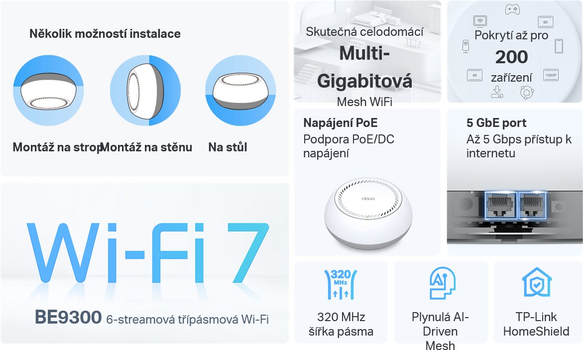 Zažijte síť nové generace s třípásmovou Wi-Fi 7 s 6 datovými streamy, rychlostí až 8647 Mb/s (6 GHz) + 4324 Mb/s (5 GHz) + 688 Mb/s (2.4 GHz) a šířkou pásma až 320 MHz. Díky možnosti montáže na strop, stěnu nebo položení na stůl se snadno přizpůsobí vašemu interiéru a zajistí optimální pokrytí.