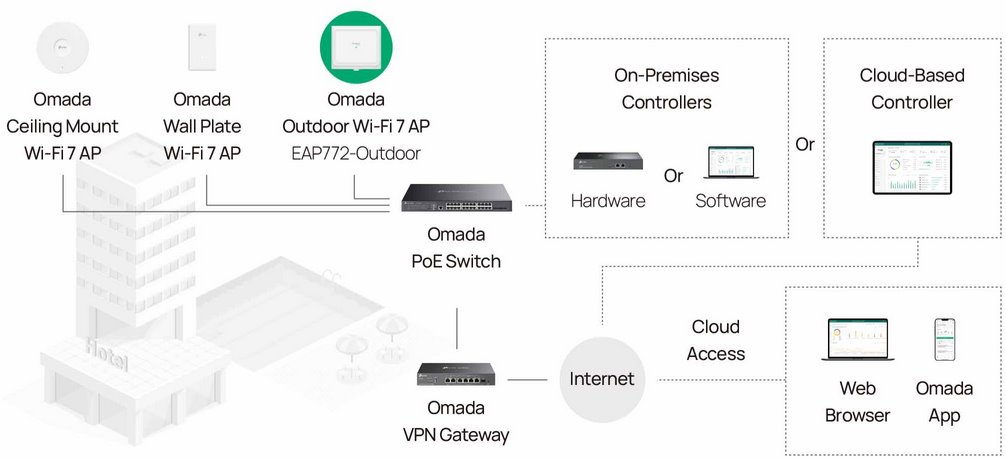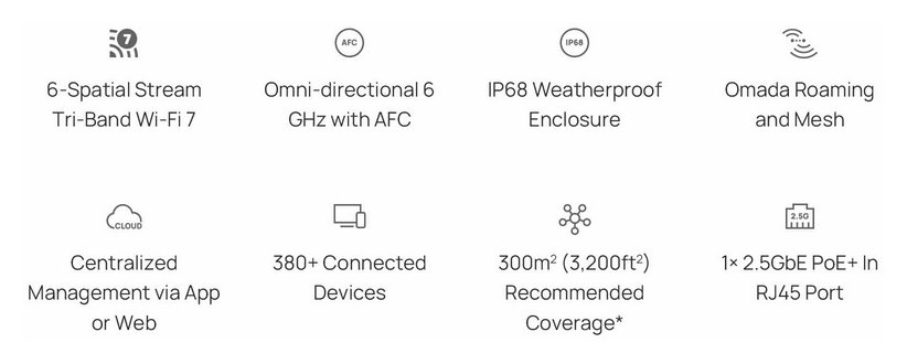 Výkonný přístupový bod přináší revoluci do venkovních sítí díky Tri-Band Six-Stream Wi-Fi 7, která poskytuje až 688 Mb/s (2.4GHz), 2882 Mb/s (5GHz), 5765 Mb/s (6GHz). Díky 6 GHz pásmu odemčenému pomocí AFC je možné využití nejmodernějšího spektra i venku, což zajišťuje vysokou rychlost a spolehlivé připojení pro různé komerční i rezidenční prostory.