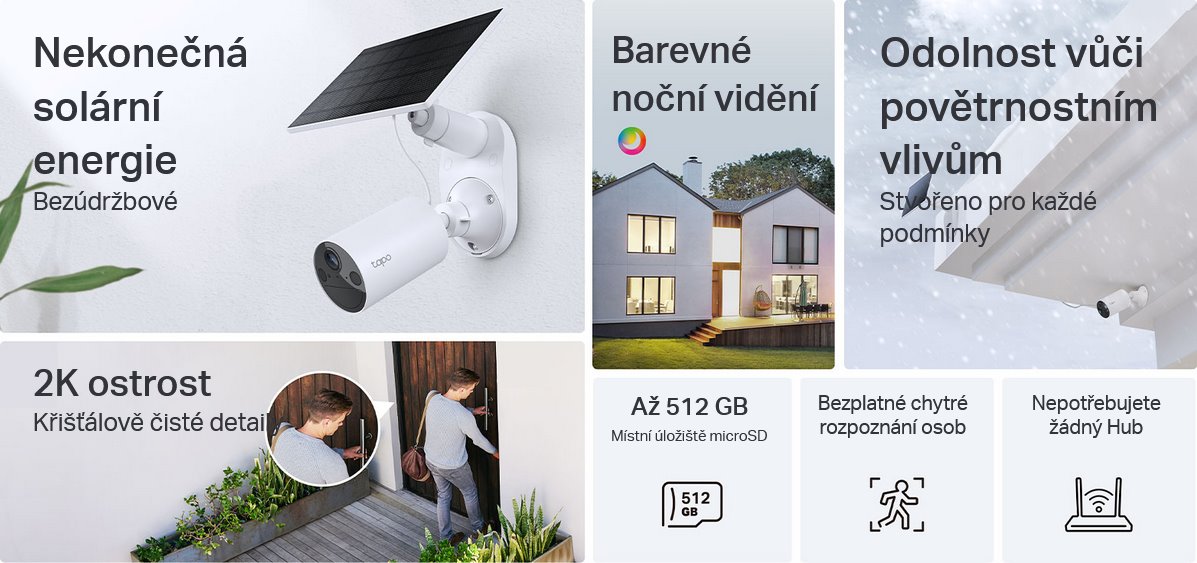 Bezdrátová venkovní kamera s 3Mpx rozlišením (2304 × 1296 px při 15 fps) a pozorovacím úhlem 111° nabízí spolehlivé zabezpečení i v noci díky podpoře barevného nočního vidění a infračervenému režimu s dosahem 9 metrů. Integrovaná baterie umožňuje provoz až 180 dní bez slunce, přičemž nabíjení probíhá přes USB-C nebo přiložený solární panel. Funkce detekce osob eliminuje zbytečná oznámení, zatímco obousměrné audio usnadňuje komunikaci. Záznamy lze ukládat na microSD kartu až do 512 GB a vše pohodlně ovládat přes aplikaci Tapo.