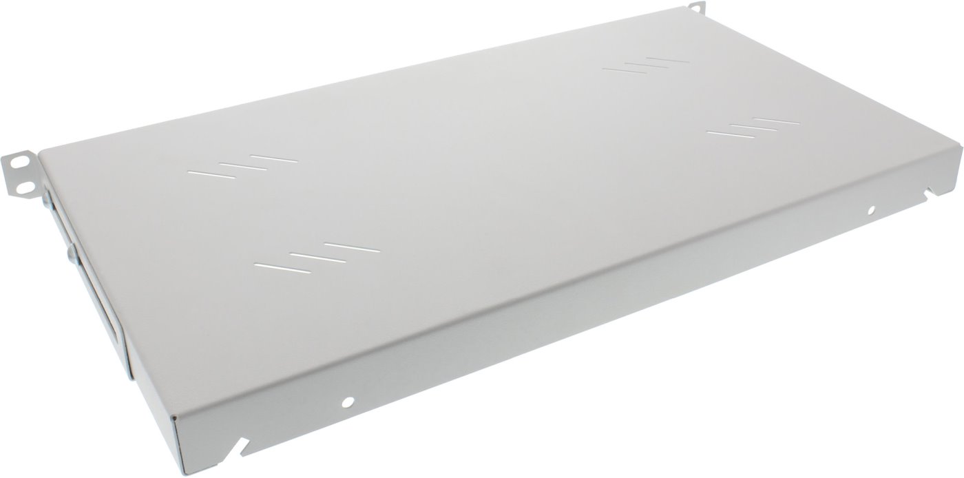 Perforovaná polici typu A4 s instalací do datových 19" rozvaděčů má výšku pouhých 1U, hloubku 250 mm, šedou barvu a zvládne nosnost až 20 kg. Inovativní design zahrnuje 2 integrované podpěry, které jsou umístěny uvnitř police, což zajišťuje kompaktnější rozměry pro snadnou přepravu a jednodušší montážní práce.