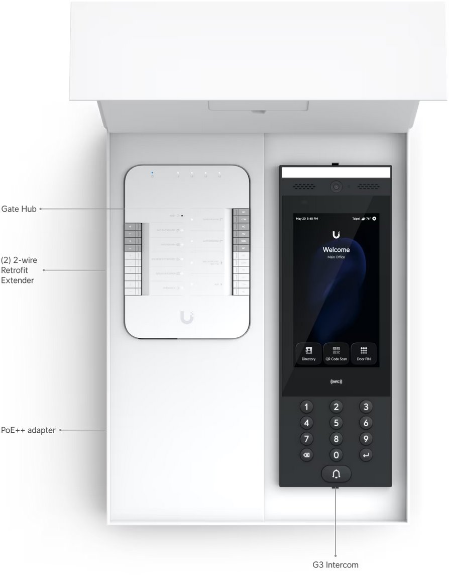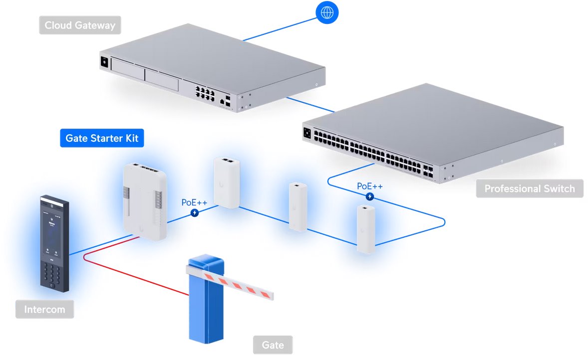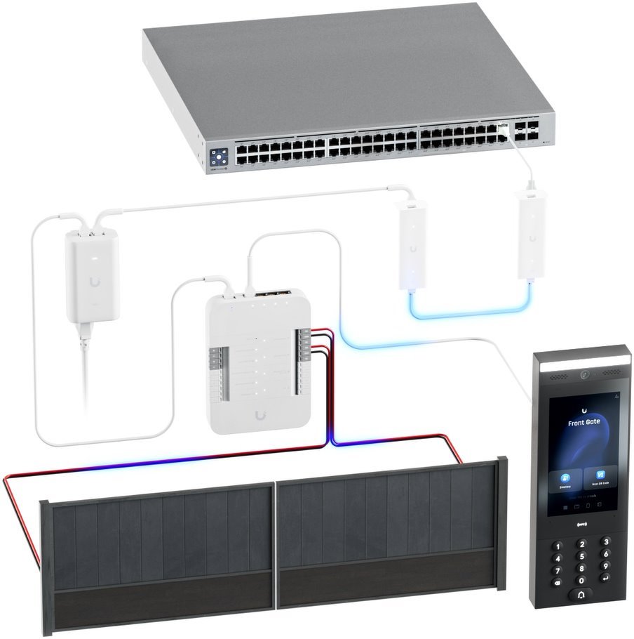 Startovací sada nabízí inteligentní kontrolér UA-Hub-Gate, moderní interkom UA-G3 s kamerou a napájecí příslušenství pro pohodlnou instalaci bez nutnosti nové kabeláže. Díky PoE++ adaptéru a 2-Wire extenderům lze snadno využít stávající infrastrukturu. Celý systém podporuje přístup pomocí funkce Touch Pass, což zajišťuje bezpečné a pohodlné ovládání vstupu jedné brány v rezidenčním i komerčním prostředí.