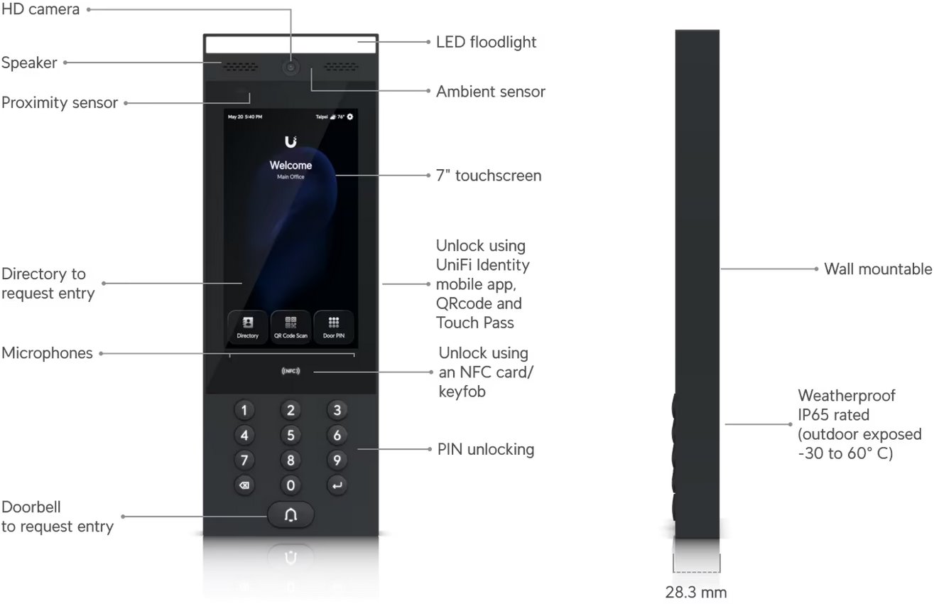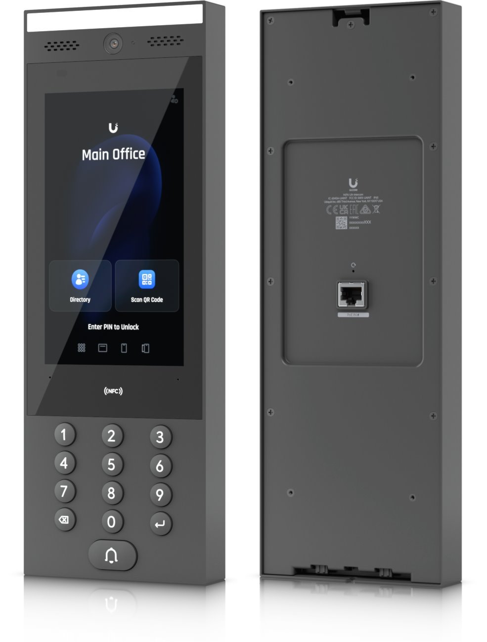 Stylové vstupní zařízení s 7" barevným dotykovým displejem nabízí intuitivní ovládání a snadnou komunikaci se systémem. Díky integrované 2Mpx kameře a čtečce Mifare karet zajistí bezpečný a pohodlný přístup. Podsvícená klávesnice, Bluetooth konektivita a krytí IP65 umožňují použití i ve venkovním prostředí. Napájení přes PoE zjednodušuje instalaci, zatímco síťový port GbE zajišťuje spolehlivý provoz v každém systému UniFi Access.