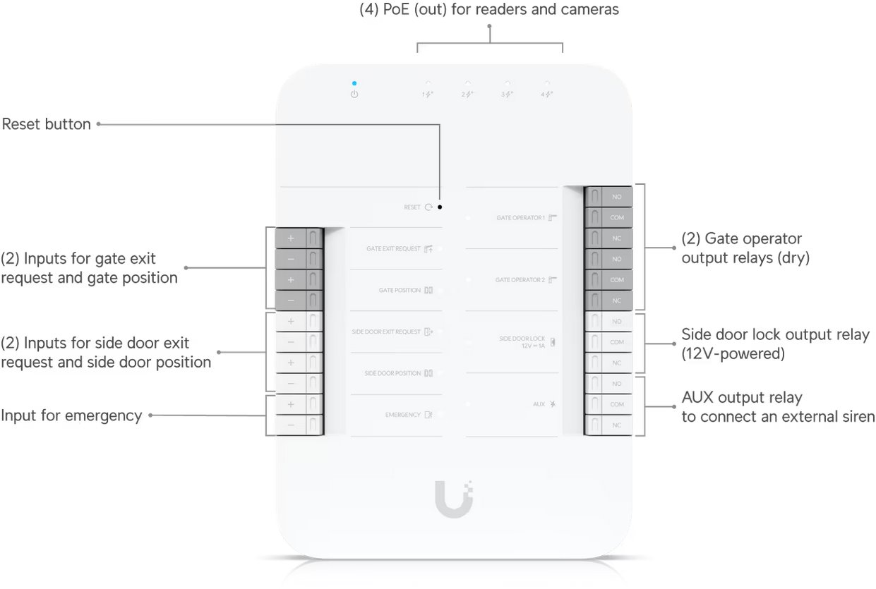 Řídicí jednotka s montáží na DIN lištu nabízí komplexní správu vstupních bodů s podporou PoE++ napájení a až čtyřmi PoE výstupy pro připojení čteček nebo kamer. K dispozici jsou vstupy pro požadavky na otevření brány i dveří, detekci jejich polohy a nouzové stavy. Dva výstupní relé pro brány a AUX relé pro externí sirénu zajišťují flexibilitu pro různé typy instalací v zabezpečených objektech.