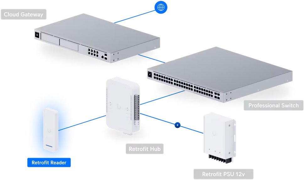 UniFi Access dveřní hub je základní komponent k instalaci přístupového systému UniFi Access . UniFi Access Hub je inteligentní dveřní IP kontroller pro jedny dveře, který je kompatibilní s většinou