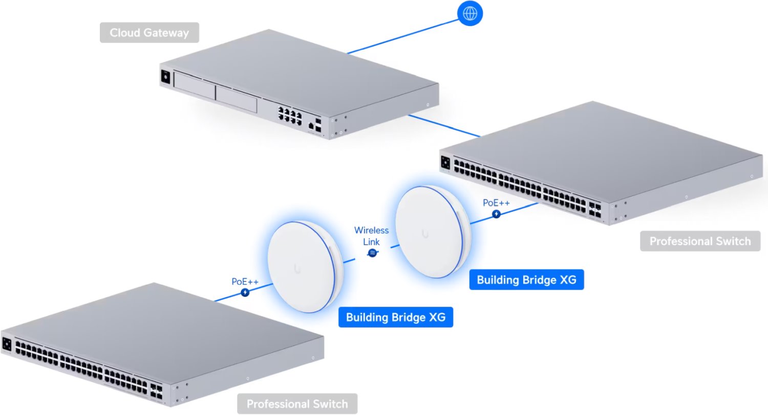 UniFi Building to Building Bridge XG, vyvinutý firmou Ubiquiti Networks, je kompaktní zařízení pro spojení dvou budov na krátké vzdálenosti, které pracuje na frekvenci 60 GHz a splňuje normy 802.11ad/ay. Toto zařízení je doplněno o záložní 5 GHz modul (Wi-Fi 5 - 802.11ac) a dosahuje vzdáleností přes 500 metrů. Má Gigabitový LAN port s podporou PoE, jedno SFP+ rozhraní a Bluetooth pro snadné nastavení pomocí mobilní aplikace UniFi Network. Použití tohoto zařízení je omezeno na mód bridge a podporuje více kanálových šířek v 60GHz pásmu - 2160 i 4320 MHz. Výrobce udává maximální propustnost až 6 Gbps.