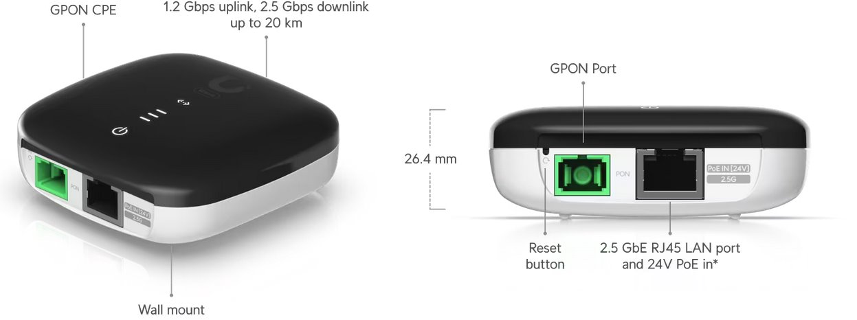 Kompaktní GPON ONU určená pro FTTH instalace s podporou rychlého připojení až 2,5 Gbps downlink / 1,2 Gbps uplink na vzdálenosti až 20 km. Vybavena jedním optickým portem SC/APC a jedním 2,5 GbE RJ45 LAN portem, usnadňuje distribuci vysokorychlostního internetu do domácností i malých firem. Jednotka je napájena pasivním 24 V PoE a díky plastovému kompaktnímu provedení (77 × 77 × 26 mm) je vhodná pro stůl i montáž na zeď. Správa probíhá snadno přes UISP platformu s podporou VLAN, NAT, směrování a zabezpečením GEM port šifrováním.