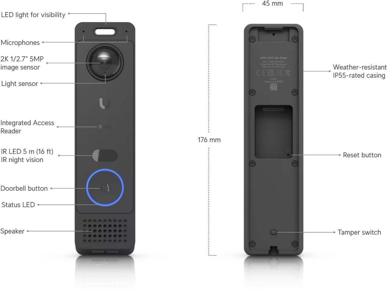 Elegance a inteligence v jednom – vysoce kvalitní 5 Mpx kamera s pozorovacm úhlem 100° zajišťuje detailní obraz při každém zazvonění a s přídavnou kamerou vidíš i balíky nebo předměty poblíž dveří. Díky obousměrné audio komunikaci s mikrofonem a reproduktorem můžeš hovořit s návštěvníky odkudkoliv přes aplikaci UniFi Protect, zatímco vestavěná čtečka NFC, Apple Wallet a Google Wallet rozšiřuje možnosti autentizace návštěv.