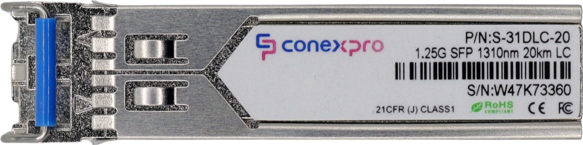 Gigabitový Singlemode SFP modul od výrobce Conexpro s vlnovou délkou (Tx i Rx) 1310 nm, rychlostí 1 Gbps, vybavený dvěma LC konektory s UPC broušením a je určený pro spojení na vzdálenost až 20 km. Modul je speciálně upraven a je kompatibilní pouze se zařízeními HPE Aruba Networking ProCurve a dalších značek dle MSA standardu. Samozřejmostí je podpora diagnostiky optického spoje pomocí funkce DDM (Digital Diagnostic Monitoring).