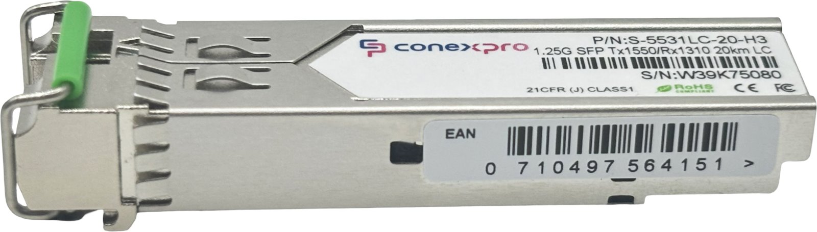 Gigabitový WDM/Bidi Singlemode SFP modul od výrobce Conexpro s vlnovou délkou (Tx/Rx) 1550/1310 nm, rychlostí 1 Gbps, vybavený jedním LC konektorem s UPC broušením a je určený pro spojení na vzdálenost 20 km. Modul je speciálně upraven pro zajištění široké kompatibility, včetně plné podpory zařízení HP / H3C / 3Com a dalších značek dle MSA standardu. Samozřejmostí je podpora diagnostiky optického spoje pomocí funkce DDM (Digital Diagnostic Monitoring).