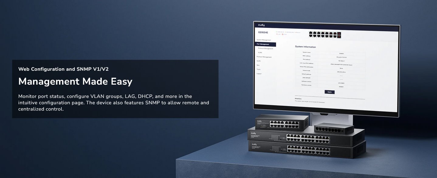 Intuitivní webová správa a SNMP poskytují plnou kontrolu nad sítí. VLAN technologie včetně 802.1Q, MTU a port-based režimů umožňují vytvářet bezpečné a výkonné síťové segmenty. Díky QoS s podporou DSCP a 802.1p jsou hlasová a video data vždy upřednostněna. Nechybí agregace linek pro vyšší propustnost, zrcadlení portů pro diagnostiku, STP/RSTP proti smyčkám ani ochranné funkce DHCP a IGMP Snooping pro stabilní a efektivní přenos dat.