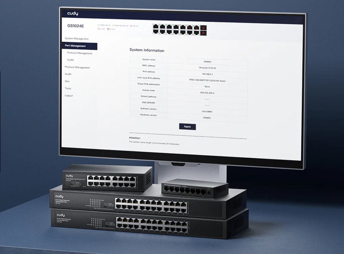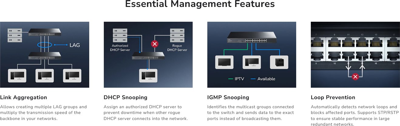Webová správa a podpora SNMP přináší přehlednou kontrolu nad sítí, zatímco funkce jako VLAN, QoS nebo port mirroring optimalizují tok dat. Detekce a prevence smyček automaticky chrání síť před výpadky a zajišťuje plynulý provoz. Podpora DHCP a IGMP snoopingu dále zvyšuje bezpečnost a efektivitu, což umožňuje spolehlivé nasazení v různých síťových scénářích.