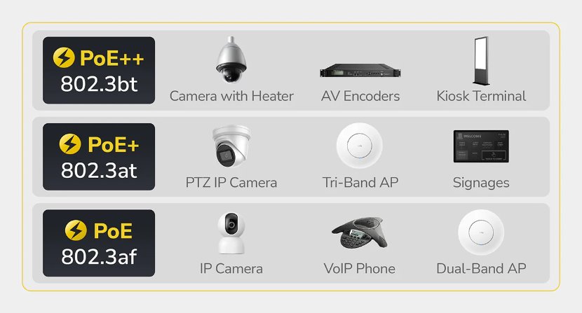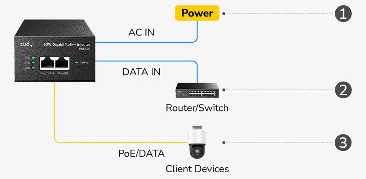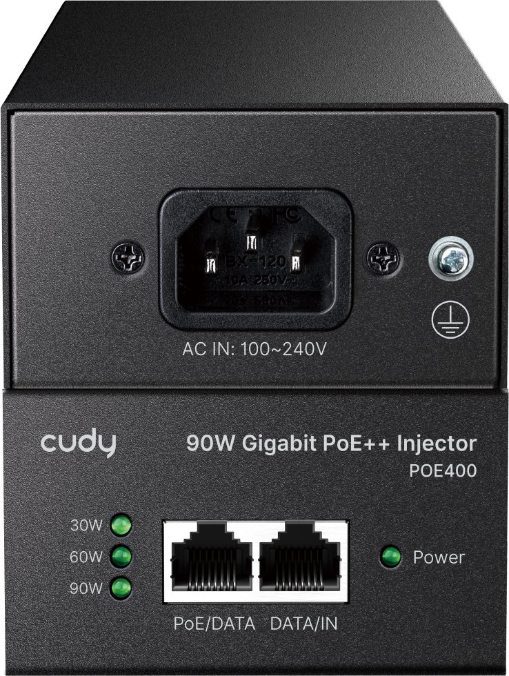 Výkonný PoE injektor značky Cudy umožňuje přenos napájení i dat až do vzdálenosti 100 metrů s podporou rychlostí 10M/100M/1G. Díky standardům 802.3af/at/bt poskytuje až 90 W výkonu přes čtyři páry vodičů a je tak ideální pro napájení náročnějších zařízení, jako jsou IP kamery, přístupové body, VoIP telefony či síťové switche. Kovové pouzdro s možností montáže na stěnu zajišťuje dlouhou životnost a spolehlivý provoz. Přehledné LED diody indikují napájení a zatížení PoE portu.
