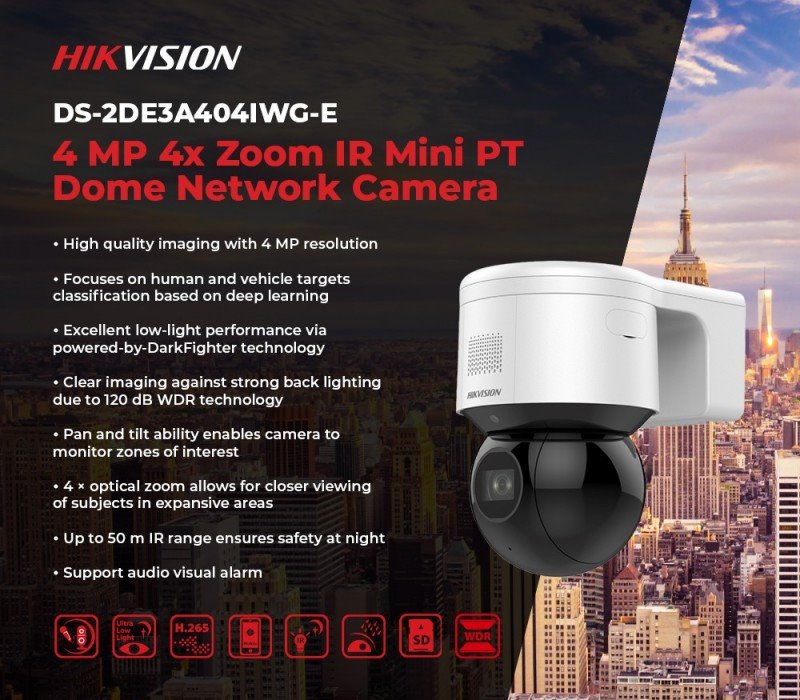 Vestavěné deep-learning algoritmy dokážou rozpoznávat osoby a vozidla a přesně filtrovat události, což výrazně snižuje počet falešných poplachů. Kamera disponuje detekcí překročení čáry, narušení oblasti, opuštění či vstupu do zóny a detekcí zanechaných nebo odstraněných předmětů. Otočný mechanismus s rozsahem 350° horizontálně a 90° vertikálně spolu s PTZ funkcemi nabízí maximální přehled a kontrolu. K dispozici je až 300 předvoleb, 8 patrol tras a funkce 3D pozicování pro rychlou orientaci v prostoru.Flexibilní připojení a chytré úložiště