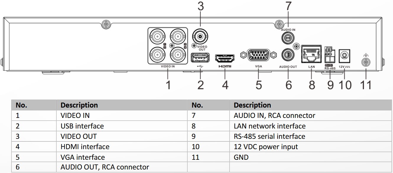 Uvnitř zařízení je místo pro 1 HDD s maximální kapacitou 10TB. Do sítě se zařízení připojuje jedním LAN portem o rychlosti 10/100Mbps, pro připojení periferií slouží 2 USB porty, má alarmové vstupy/výstupy (4/1) a 1x RS-485 pro PTZ. Pro obrazový výstup slouží 1 BNC konektor s rozlišením 704x576, HDMI s max .rozlišením 2560 x 1440 px a VGA výstup s maximálním rozlišením 1920 x 1080px. Maximální spotřeba samotného rekordéru bez HDD je 10W.