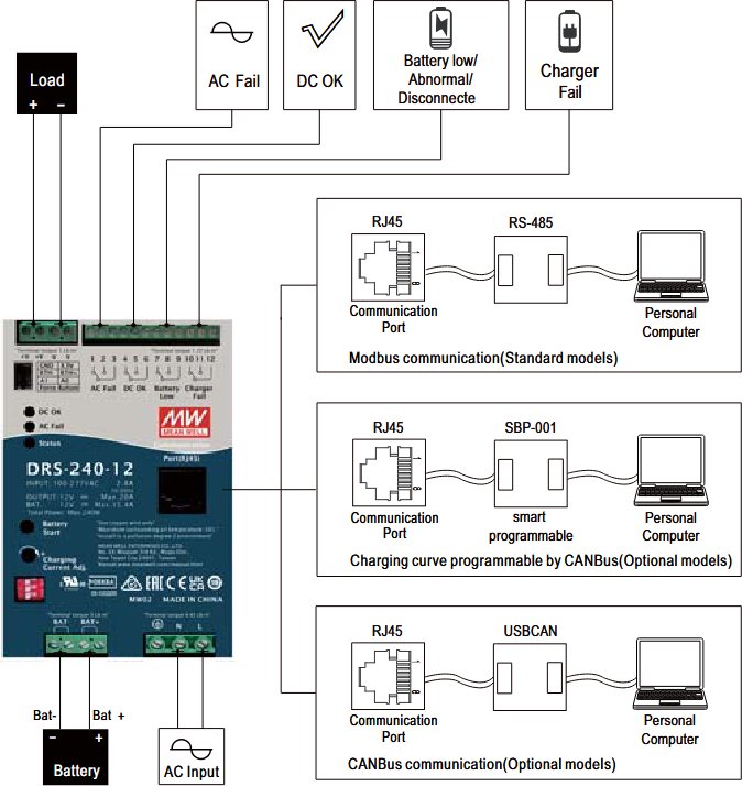 Programovatelný zálohovaný zdroj umožňuje konfiguraci signálů a alarmů přes komunikační rozhraní. Díky možnosti nastavení nabíjecího proudu v rozsahu 20–100 % a volbě mezi 2 nebo 3stupňovým režimem pomocí DIP přepínače lze jednotku přesně přizpůsobit požadavkům systému. Je vhodná pro olověné i lithium-iontové baterie a podporuje úpravu nabíjecí křivky pomocí nástroje SBP-001 pro maximální životnost a bezpečnost akumulátorů.