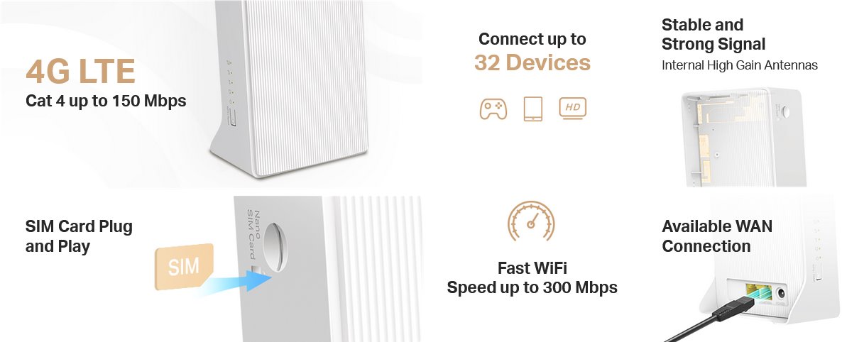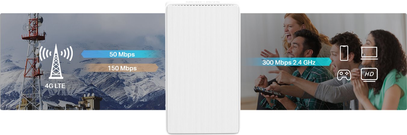 Využijte naplno přínosy bezdrátové sítě 4G LTE s routerem Mercusys, který dokáže dosáhnout rychlost stahování až 150 Mb/s po mobilní síti - vložte nano SIM a vše máte připravené. Router umožňuje sdílet vaši síť 4G LTE s více zařízeními pomocí 2.4 GHz Wi-Fi s rychlostí 300 Mbps pro dostatečnou rychlost při prohlížení a stahování dat, videostreamů či videohovorů. Zařízení umožňuje operační mód AP Router ale i failover v případě selhání konektivity přes kabelový WAN.