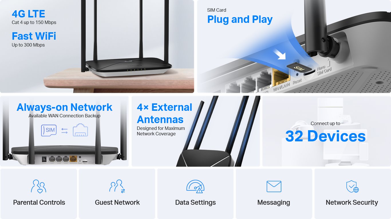 Bezdrátový 4G LTE router od Mercusys nabízí spolehlivé připojení s možností failover přes WAN port, což zajistí nepřetržitý internet. Podporuje 4G sítě kategorie 4 s rychlostí až 150/50 Mbps a poskytuje stabilní 2.4 GHz Wi-Fi s technologií 2x2 MIMO. K dispozici je nano SIM slot a 3x 10/100 Mbps LAN + 1x 10/100 Mbps LAN/WAN port. Díky čtyřem fixním anténám a jednoduchému zapojení plug and play je ideální pro domácnosti, menší kanceláře nebo chalupy.