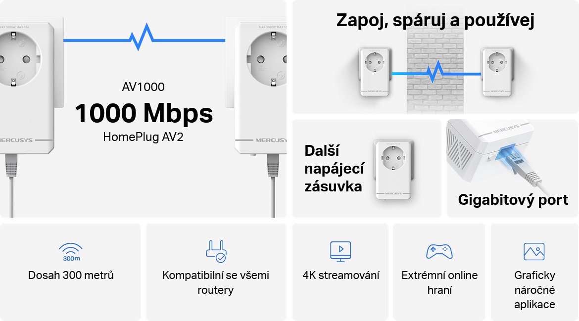Zažijte vysokorychlostní přenos až 1000 Mbps díky pokročilé technologii HomePlug AV2, která využívá stávající elektrické vedení k přenosu dat. Adaptéry poskytují superrychlé kabelové připojení přes gigabitový port, ideální pro stolní počítače, chytré televize i herní konzole. S dosahem až 300 metrů po elektrickém okruhu se spolehlivě postará o silný signál i ve větších domech. Díky průchozímu portu navíc neztratíte žádnou zásuvku – snadno připojíte další zařízení bez omezení komfortu.