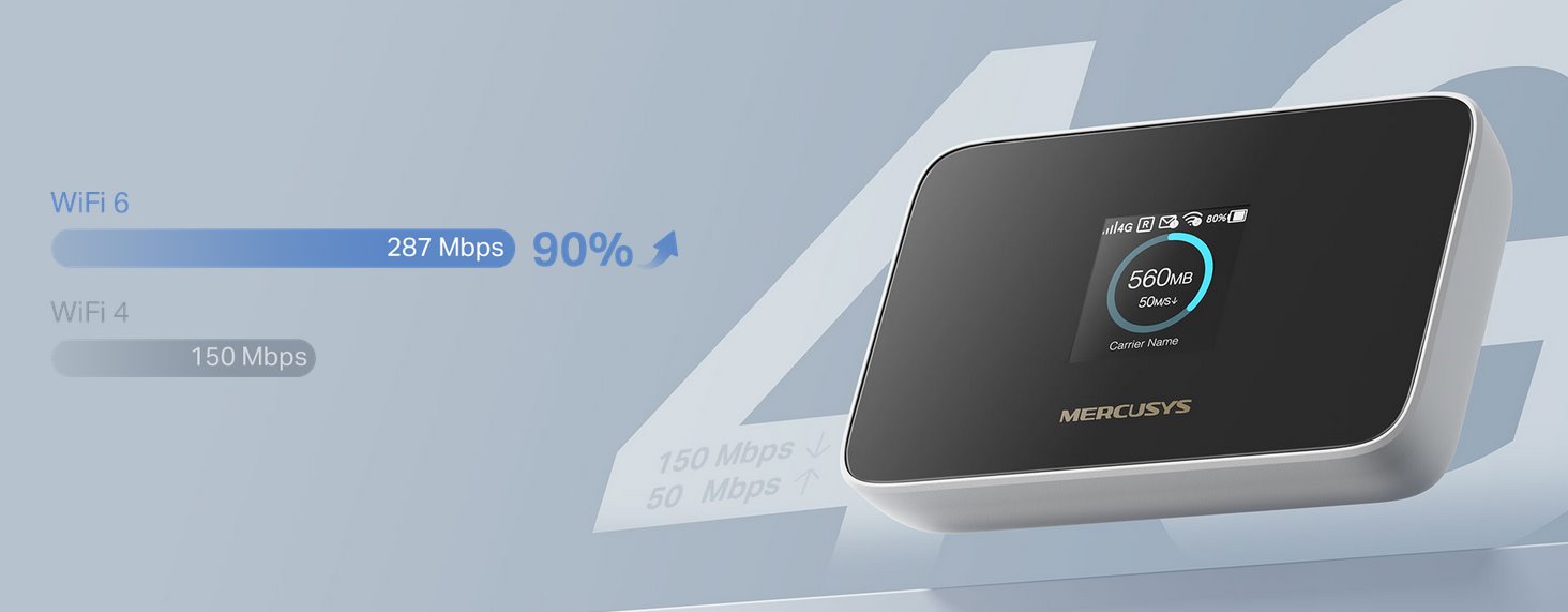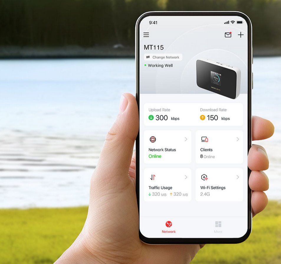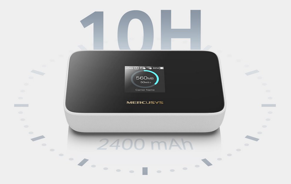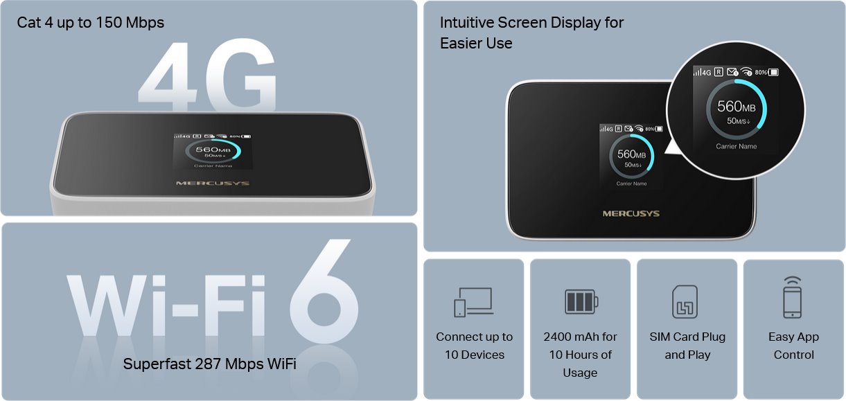 Zařízení je vybaveno 2400 mAh baterií poskytující až 10 hodin provozu, ideální pro cestování nebo práci mimo domov. Přehledný intuitivní displej zobrazuje všechny důležité informace, takže snadno sledujete využití dat a nepřekročíte měsíční limit. Správa zařízení je jednoduchá díky aplikaci MERCUSYS App, která umožňuje snadné ovládání, sdílení a monitoring připojení. Router kombinuje rychlost, pohodlí a flexibilitu pro každodenní i profesionální použití.