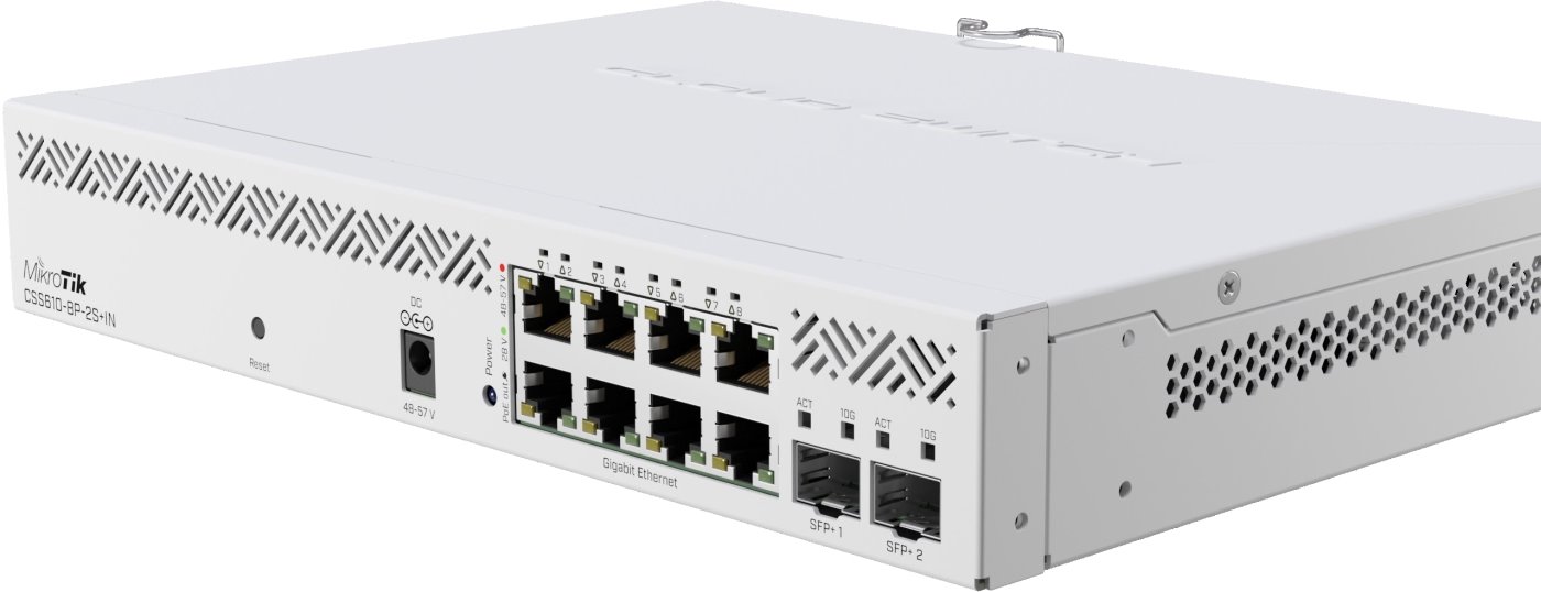 MikroTik Cloud Smart Switch CSS610-8P-2S+IN je managovatelný, 8portový Gigabitový PoE Switch se dvěma SFP+ sloty (zpětně kompatibilní i se SFP moduly), bez ventilátoru a kitem pro přichycení do 19" racku. Switch disponuje 140W PoE budgetem pro napájení až 8 zařízení pomocí 802.3af/at standardů s maximální zátěží 30 W / port.