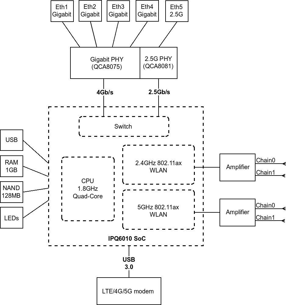 Chateau 5G ax je Dual Band 2.4/5GHz Wi-Fi 6 router do domácnosti či malých firem s (4) Gigabit LAN + (1) 2.5-Gigabit porty, 5G modemem, jedním USB portem, L4 licencí a extra rychlým 4jádrovým ARM CPU s taktem 1800 MHz, vnitřním uložištěm 128 MB a 1 GB RAM. Uživatel tak může souběžně používat 2.4GHz kanál pro asociovaná mobilní bezdrátová zařízení a 5GHz kanál mít vyhrazen např. pro TV streamování videa. Modulační rychlost 2.4GHz rádiové části (2x2 MIMO) je 574 Mbps a pro 5GHz (2x2 MIMO) je to 1200 Mbps. Chateau 5G ax disponuje šesti vestavěnými anténami pro 5G/LTE, dvěma 5G/LTE externími anténami a dvěma anténami pro Wi-Fi, které jsou součástí balení.