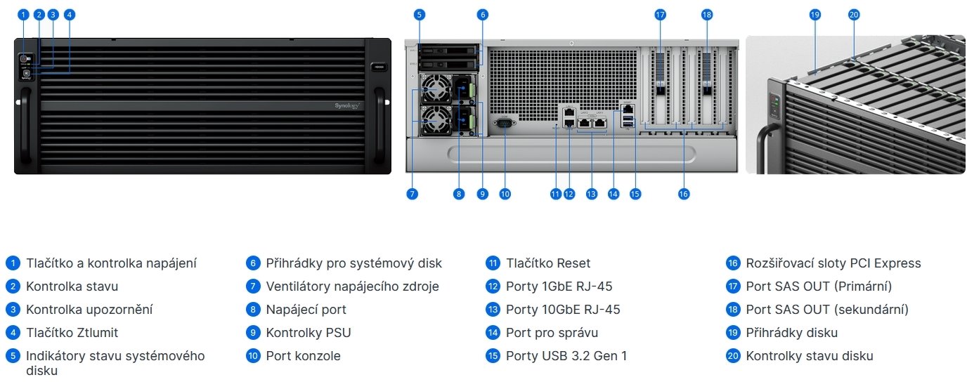 Dvojice procesorů Intel Xeon Silver s až 10 jádry a podpora až 512 GB paměti DDR4 ECC RDIMM poskytují stabilní základ pro virtualizaci, zálohování i mediální workflow. Flexibilní síťové možnosti 10/25GbE a Fibre Channel umožňují vysokorychlostní připojení do moderních datových center. Čtyři PCIe sloty rozšiřují konektivitu dle potřeby, zatímco Btrfs systém podporuje svazky až 1 PB pro konsolidaci obrovských datových sad.
