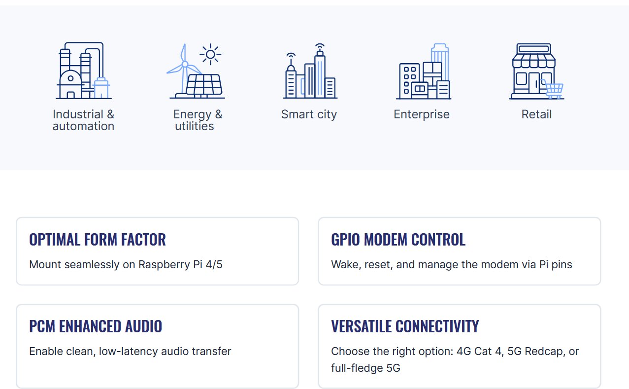 Napájení i datová komunikace probíhá přes moderní USB-C nebo GPIO rozhraní s podporou 5 V / 3,3 V DC, což poskytuje maximální flexibilitu v návrhu zařízení. HAT+ konstrukce zajišťuje čisté usazení na Raspberry Pi a tím zásadně šetří místo uvnitř skříní či kiosků. Calyx 5G přináší extrémní rychlost a maximální šířku pásma pro HD video, streamování i real-time řízení, ideální pro projekty bez kompromisů v rychlosti a spolehlivosti.