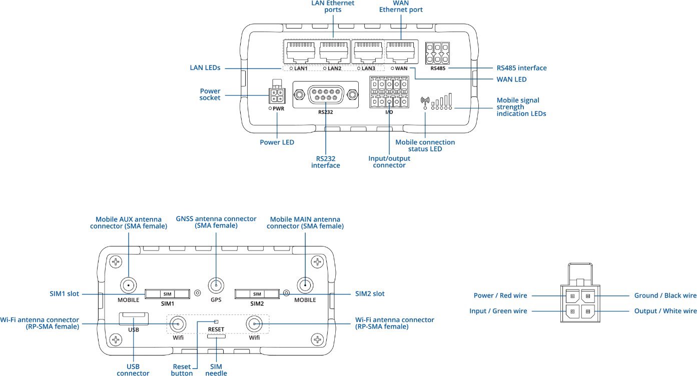 Široké možnosti připojení zahrnují 4× Ethernet (1× WAN, 3× LAN), Wi-Fi 802.11b/g/n a sériová rozhraní RS232 a RS485 pro integraci se stávající infrastrukturou. Nechybí digitální a analogové I/O porty pro monitoring a řízení technologií ani integrovaný GNSS (GPS, GLONASS, BeiDou, Galileo) pro přesnou lokalizaci a synchronizaci času. Procesor Mediatek MIPS 580 MHz a 128 MB RAM zajišťují stabilní provoz, což z tohoto řešení činí spolehlivý základ pro průmyslové sítě, energetiku i dopravu.