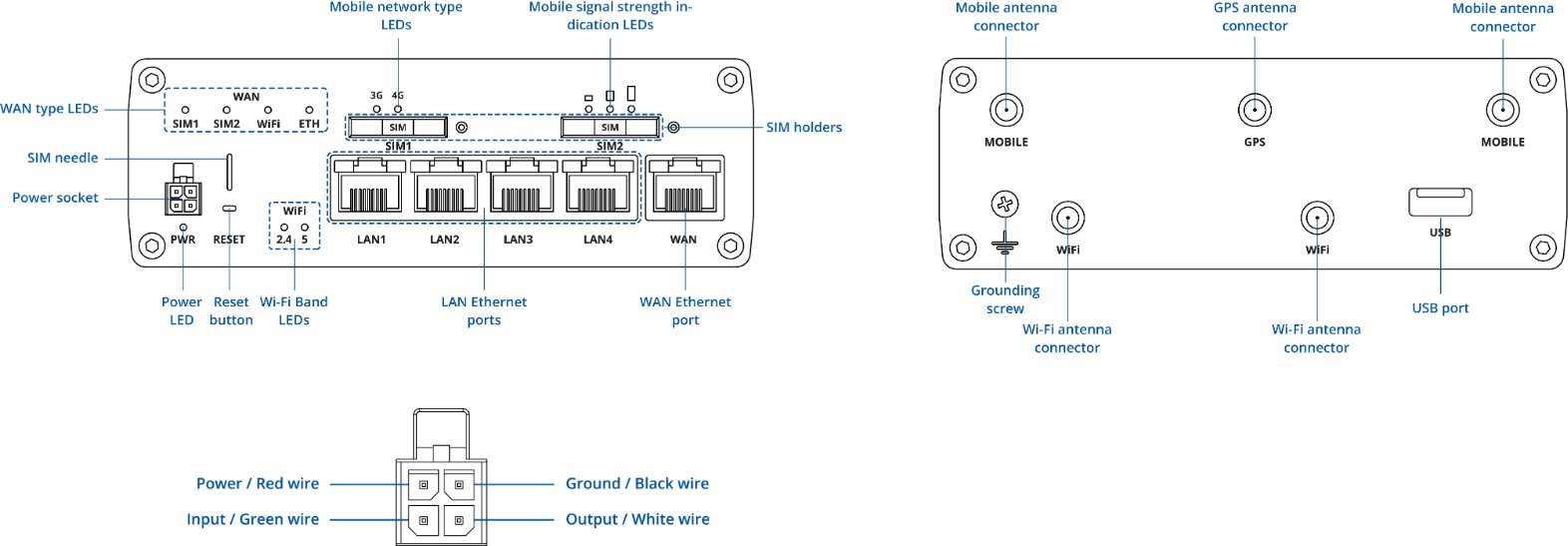 Kabelový adaptér slouží k oddělení napájení a I/O signálů pro zařízení Teltonika. Na jedné straně je vybaven 4-pinovým samičím konektorem, který se připojuje k zařízení, na druhé straně 4-pinovým konektorem a