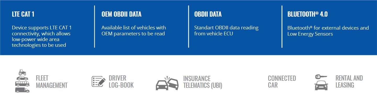Tracker využívá LTE CAT 1 s možností záložní 2G sítě, což umožňuje spolehlivé a energeticky úsporné připojení pro široké spektrum aplikací. Díky plug and play designu je instalace jednoduchá a rychlá, aniž by bylo nutné složité nastavování. Zařízení podporuje také Bluetooth® 4.0, takže je možné propojit externí zařízení, nízkoenergetické senzory nebo provádět aktualizace firmwaru a konfigurace přímo přes bezdrátové připojení. Tato kombinace moderní konektivity a kompatibility s širokým spektrem zařízení zajišťuje flexibilní nasazení v různých prostředích, od firemních vozových parků po pojišťovací telematiku.