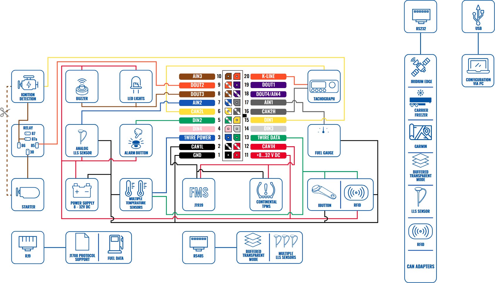 Zařízení umožňuje stahování tachografových souborů a live dat přes K-Line, Tacho CAN nebo FMS pro efektivní správu řidičů. Dále nabízí 1× RS-232/RS-485 + 1× RS-232 pro připojení externích zařízení, jako jsou senzory, RFID čtečky nebo teploměry, což umožňuje sledování nákladu, stavu paliva a dalších parametrů. Kompletní přehled o provozu vozidel a strojů zajišťuje včasné odhalení poruch, monitoring přívěsů a brzd, a umožňuje škálovat projekty s připojením nových zařízení podle potřeb fleet managementu.