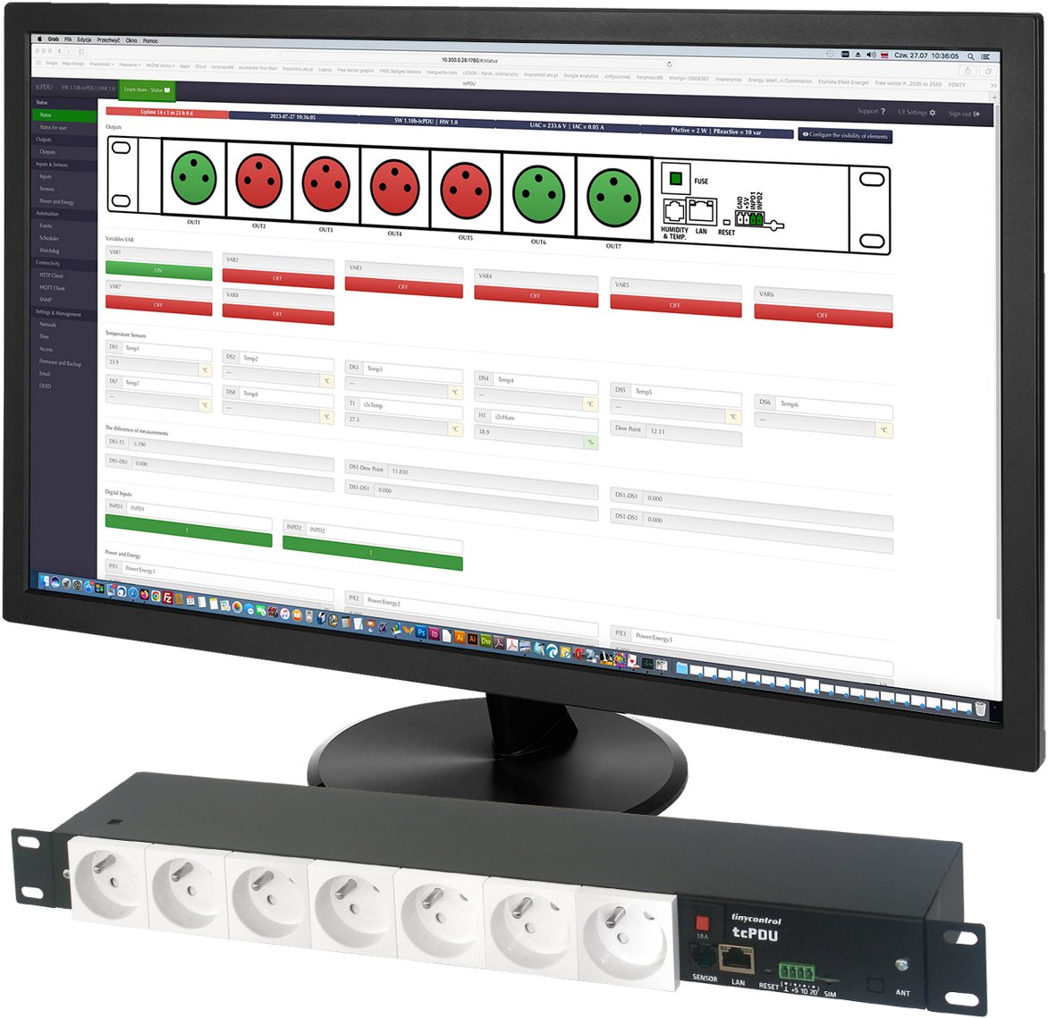 Tinycontro tcPDU chytrý napájecí distribuční panel 7x 230V do 19" racku
