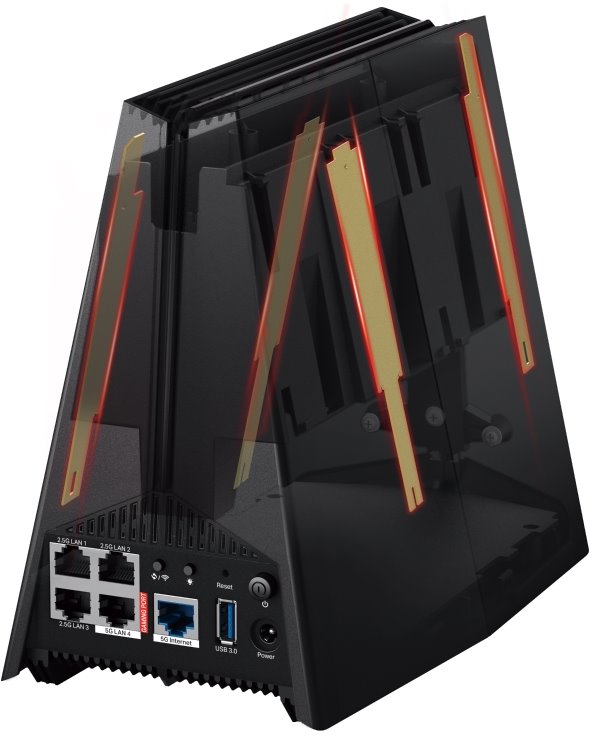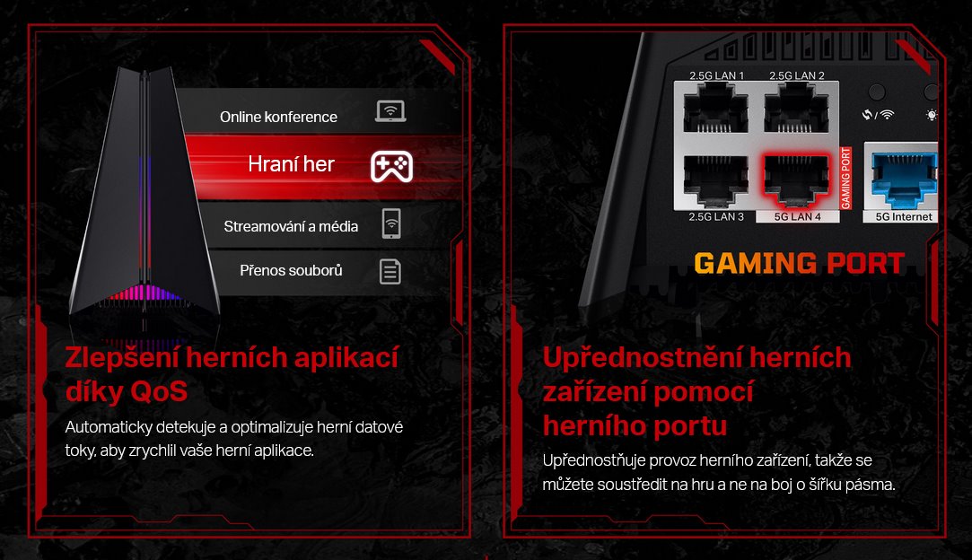 Router disponuje pokročilou herní akcelerací, která automaticky detekuje herní data a optimalizuje je pro co nejnižší latenci. Vyhrazený herní 5GHz kanál zabraňuje rušení ostatními zařízeními v domácnosti, zatímco technologie GPN (Gamers Private Network) optimalizuje spojení s herními servery díky umělé inteligenci a datové analýze v reálném čase. Nechybí pět multigigabitových portů: 1× 5Gbps WAN, 1× 5Gbps LAN, 3× 2.5Gbps LAN a 1× USB 3.0 pro širokou škálu zařízení. Flexibilní konektivita je doplněna čtveřicí výkonných antén s technologií Beamforming a přizpůsobitelným RGB podsvícením, které dodává herní sestavě jedinečný styl.